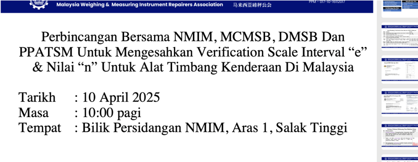 A joint meeting with National Metrology Institute of Malaysia with MCMSB, DMSB and 4 EXCO on strengthening 3 major issues related verifications of scale interval “e” for weighbridges in Malaysia. The outcomes were jointly agreed with all parties as the standard procedures for weighbridge verifications to follow, in the absence of clear instruction from KPDN which may deviated the guidelines as approved by NMIM since 2020.